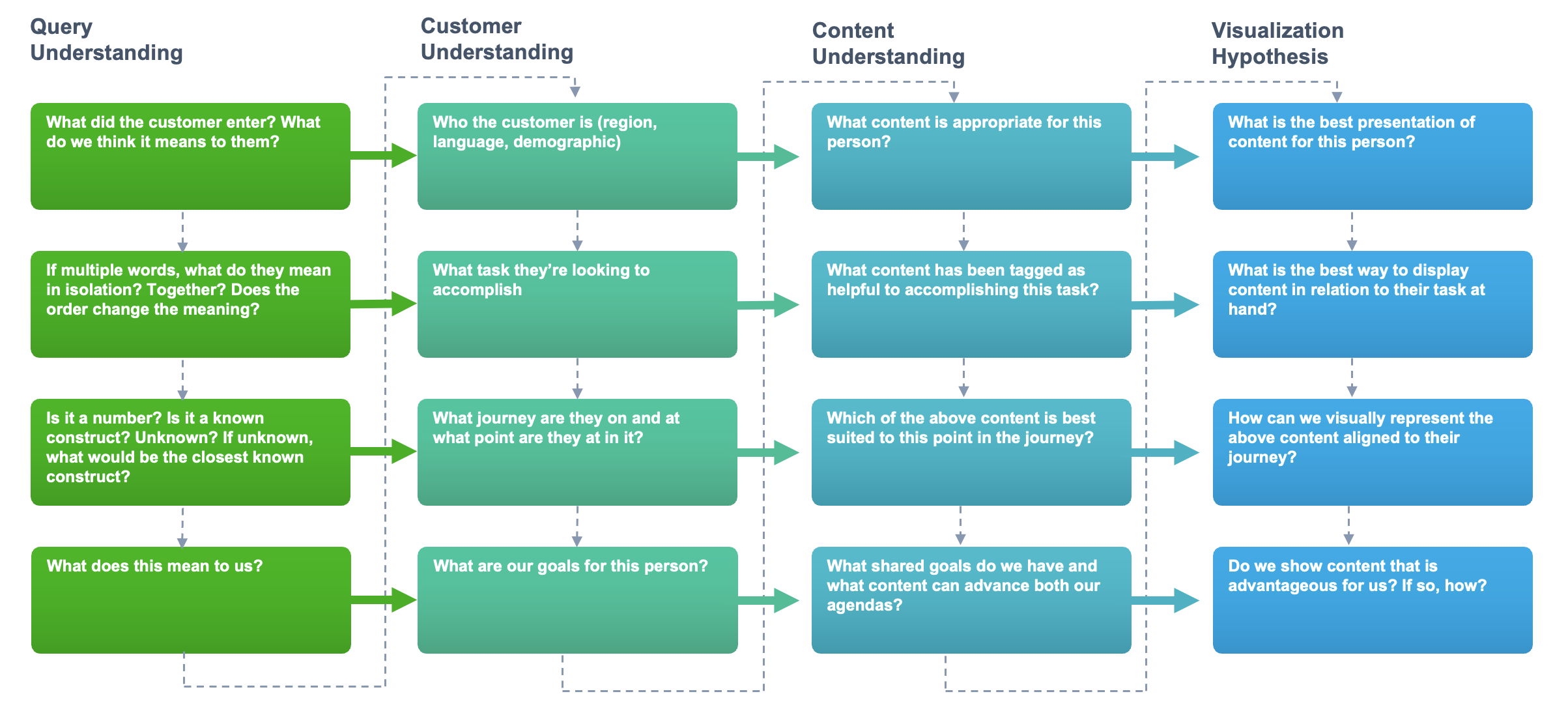 However, content presented a challenge because again, our search experience needed to be able to transform and flex depending on the customer, their background, segment, intent/task, and the content most relevant to that intent and task. The same experience needed to be able to serve up (just to name a few):
